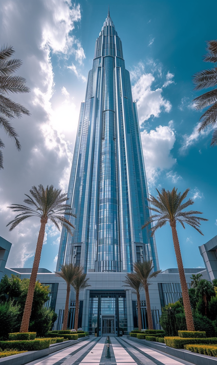 The city skyline is skyline is skyline is adorned with futuristic skyscrapers, including the iconic Burj Khalifa, the world's tallest building.